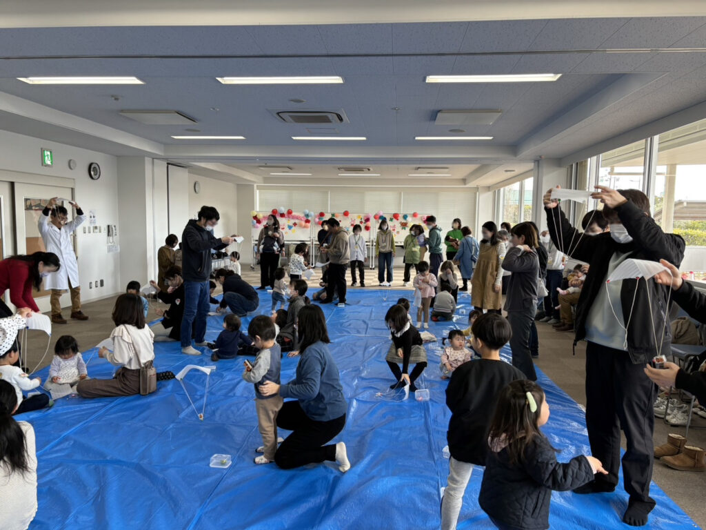 2024年3月2日(土)、高砂市のユーアイ帆っとセンターで行われた「レッツエンジョイ!子どもとあそぼう」に子育てサポート☆きらりingさんといっしょに科学おもちゃづくりの先生として参加しました。作って遊んだのは「不思議なたまご」と「アンパンマンのパラグライダー」最後に「大型空気砲」のパフォーマンスをしました。